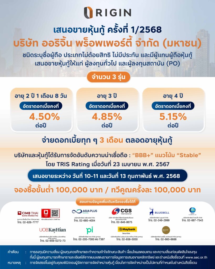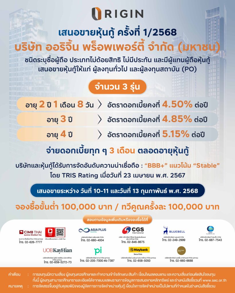 StandardBizNews – 20 มกราคม 2568 (กรุงเทพฯ ประเทศไทย) – บริษัท ออริจิ้น พร็อพเพอร์ตี้ จำกัด (มหาชน) หรือ ORI พร้อมเสนอขายหุ้นกู้ให้แก่ผู้ลงทุนทั่วไป และผู้ลงทุนสถาบัน จำนวน 3 รุ่น อัตราดอกเบี้ย 4.50 – 5.15% จ่ายดอกเบี้ยทุก 3 เดือน เสนอขายระหว่างวันที่ 10 – 11 และวันที่ 13 กุมภาพันธ์ 2568 ผ่าน 9 สถาบันการเงิน ได้แก่ ธ.ซีไอเอ็มบี ไทย บล. เอเซีย พลัส บล. ซีจีเอส-ซีไอเอ็มบี (ประเทศไทย) บล.บลูเบลล์ บล.โกลเบล็ก บล.ยูโอบี เคย์เฮียน บล.เมย์แบงก์ (ประเทศไทย) บล.พาย และบล.เมอร์ชั่น พาร์ทเนอร์ พร้อมโชว์ Backlog ในมือ 47,329 ล้านบาท รอรับรู้สร้างรายได้ต่อเนื่อง 5 ปี เตรียมโอนกรรมสิทธิ์โครงการคอนโดก่อสร้างแล้วเสร็จใหม่ปี 2568 เพิ่มอีก 13 โครงการ มูลค่าโครงการรวม 17,180 ล้านบาท มึแบ็คล็อกเฉลี่ยแล้วกว่า 70%