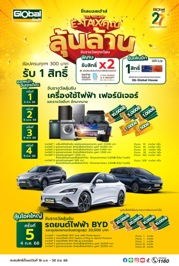 ช้อปสุดคุ้ม ลุ้นรางวัลใหญ่กับแคมเปญ “โกลบอลเฮ้าส์ TAX RECEIPT E-TAX คุณ ลุ้นล้าน” ที่มอบโอกาสให้คุณลุ้นเป็นเจ้าของรถยนต์ไฟฟ้าแบรนด์ดัง BYD พร้อมของรางวัลสุดพิเศษอีกมากมาย เช่น เครื่องใช้ไฟฟ้า เฟอร์นิเจอร์ คูปองแทนเงินสด และรางวัลอื่นๆ รวมมูลค่ากว่า 7 ล้านบาท* เริ่มสะสมสิทธิ์ได้ตั้งแต่วันที่ 16 มกราคม – 30 มิถุนายน พ.ศ. 2568 อย่าพลาดโอกาสดีๆ แบบนี้!